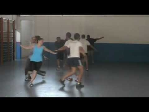 DESENVOLUPAMENT | INTRODUCCIÓ quiets/es al lloc A) Saltant, es creua la cama dreta per davant de l’esquerra, i la cama esquerra per davant de la dreta, i es torna a fer. Cada vegada que es creua una cama, donem una picada de mans amb els braços enlaire. Alternant els peus dret - esquerre, es frega a terra com si caminéssim enrere , sense moure’ns del lloc i amb les mans enrere (d - e - d - e - d - e - d - e). Es repeteix tot una altra vegada. B) S’avancen quatre passos saltant i alçant el genoll lleugerament, cap avant i quatre cap arrere (2 vegades). C Les parelles s’agafen en agarre de “Tarantella” fent gir cap a la dreta = SIAR (8 pulsacions ) i cap a la esquerra = SAR (8 pulsacions). |